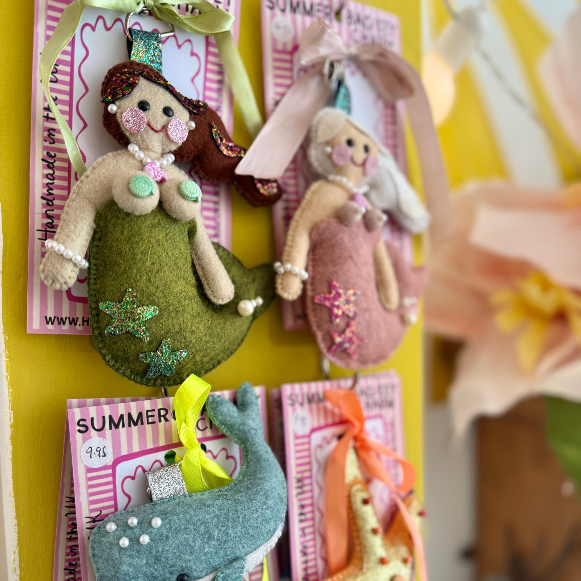 Bring a bit of handmade magic to your summer with this collection of felt sea creature bag charms, hand-cut, hand-stitched and embellished with beads and glitter felt.